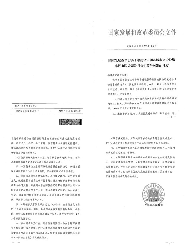 2020年5月21日,三明城投集團(tuán)申請(qǐng)發(fā)行7.7億元企業(yè)債獲得國家發(fā)改委核準(zhǔn)批復(fù),期限7年,募集資金用項(xiàng)目建設(shè)及補(bǔ)充公司營運(yùn)資金。