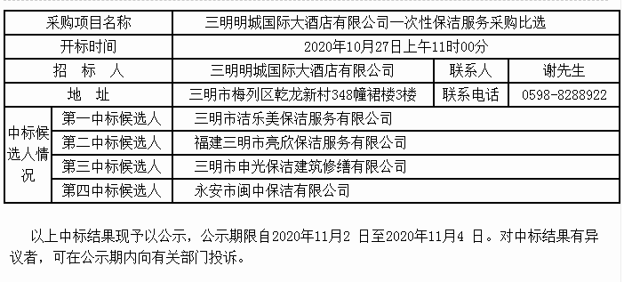 三明明城國際大酒店有限公司一次性保潔服務(wù)比選中標(biāo)公示