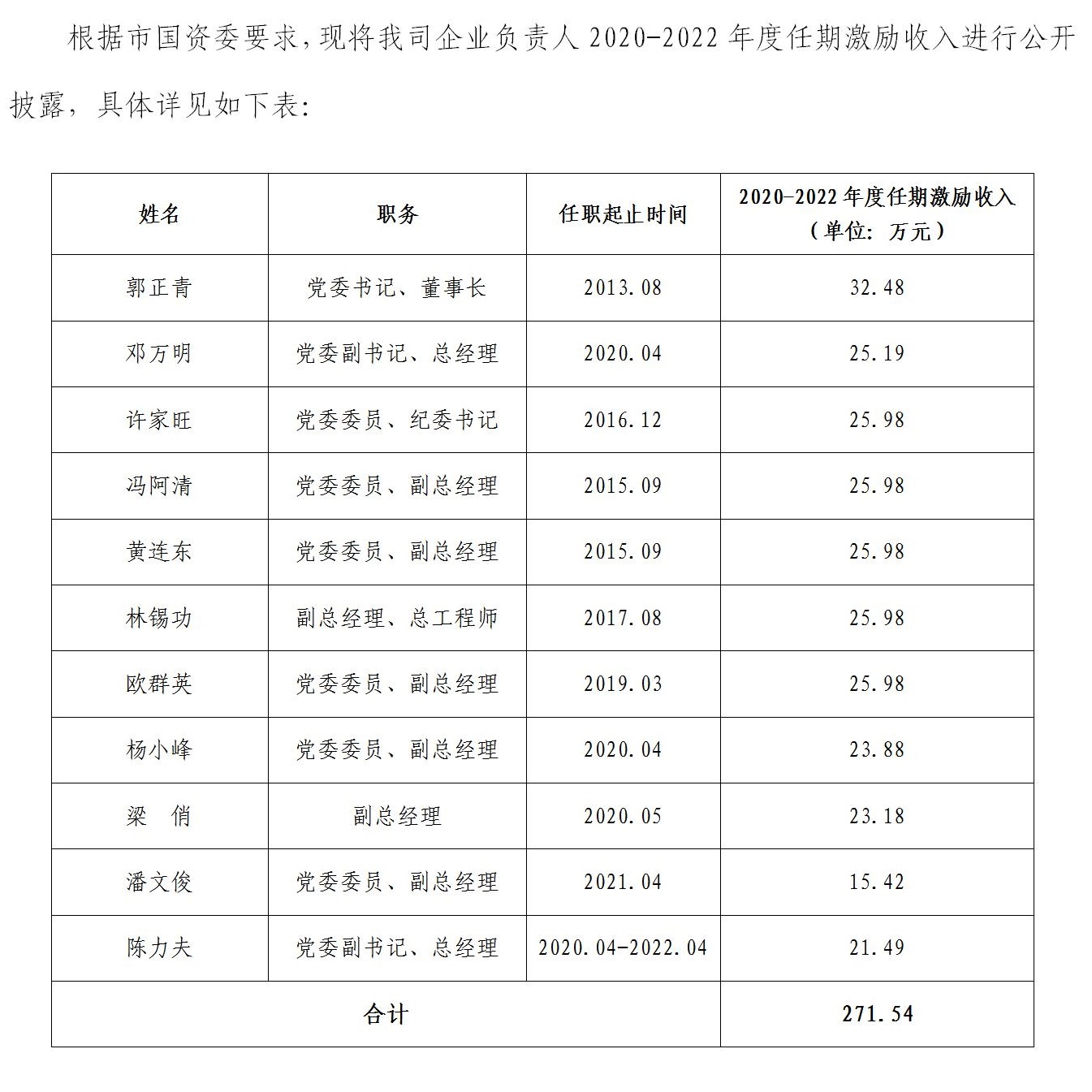 2020-2022年度市城發(fā)集團企業(yè)負責人任期激勵收入披露表